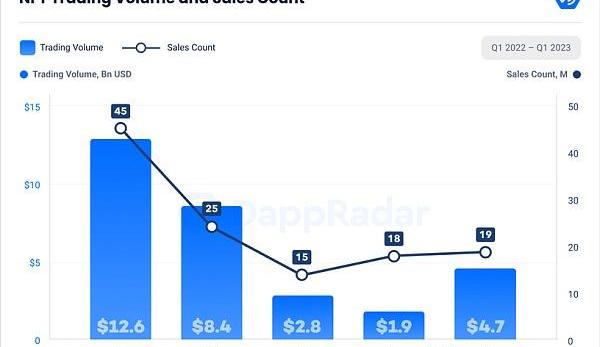 2022年下半年整个加密市场入熊之后,市场低迷,NFT市场成交量也骤减。然而在2022年底,黑马平台Blur强势崛起,正面硬刚顶流Opensea,随后,我们看到Blur强势逆袭、一步步登顶NFT平台榜首的全过程,并带来2023Q1NFT链上数据的提升。据DappRadar数据,NFT市场交易量在2023年Q1快速增长,增幅达137%,总价值47亿美元,达到了自2022年Q2以来的最高水平。