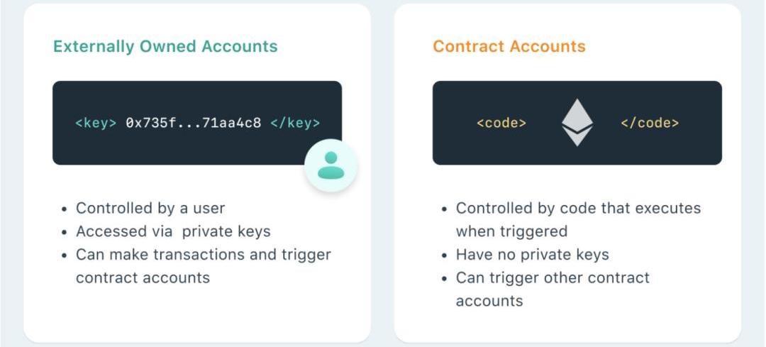 合约账户:是一段通过EOA账户部署在链上的可编程EVM代码,只能被EOA账户调用。