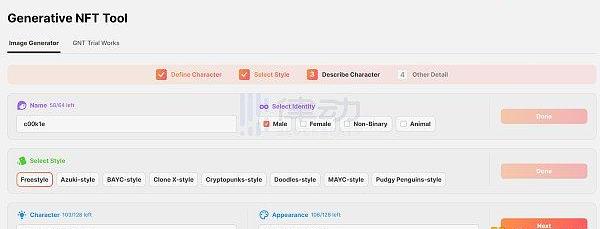 设置完成后点击「Next」,接下来要选择的是形象的画风,这里可选的画风包括了市面上的各个蓝筹NFT项目,比如「Azuki」、「BAYC」、「CloneX」等。我们选择一个Freestyle,让「GNT」自由发挥。