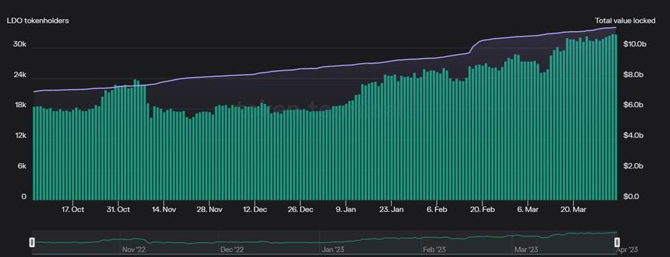 在升级后,Lido的TVL很明显将会大幅增长,从而成为LSP领域的领导者。凭借强大的声誉、更深的流动性和大量的DeFi的集成,那些寻找流动性质押项目的用户有充分的理由选择Lido。自11月以来,Lido的代币持有者数量和TVL呈上升趋势,占迄今为止ETH总质押量的近75%。