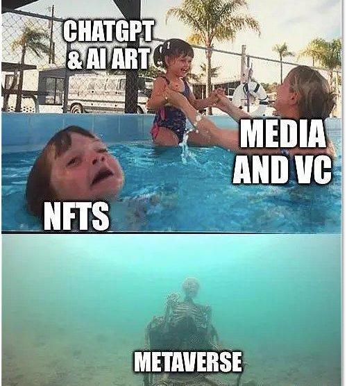 伴随着AI的火爆,普罗大众的一个明显观感是,去年如日中天的元宇宙失宠了。网友们甚至恶搞了下面这张图片:ChatGPT和AI艺术被媒体和投资机构追捧,全然不顾溺水的NFT,而元宇宙干脆在水下成了枯骨。