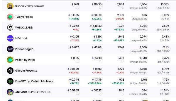 24小时NFT交易量、交易量前十项目数据来源:Coinmarketcap