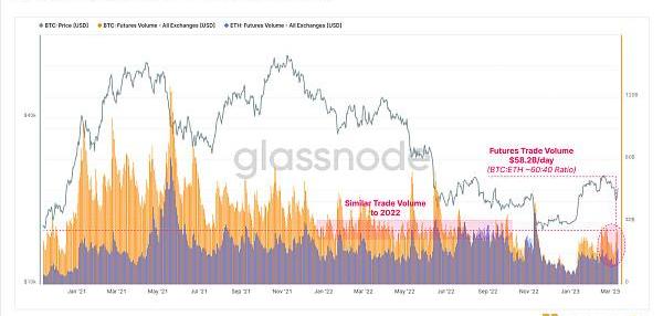 对于期货交易量,比特币的主导地位相似,约为60%,并且在FTX后和年底沉寂之后,交易量已经回升。总交易量约为582亿美元/天,相当于2022年全年的水平。