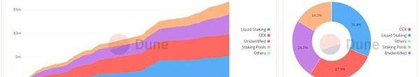 如图所示,ETH质押大致可以分为4大类,分别是流动性质押、中心化交易所质押、质押池和无法识别的个人或实体质押。
