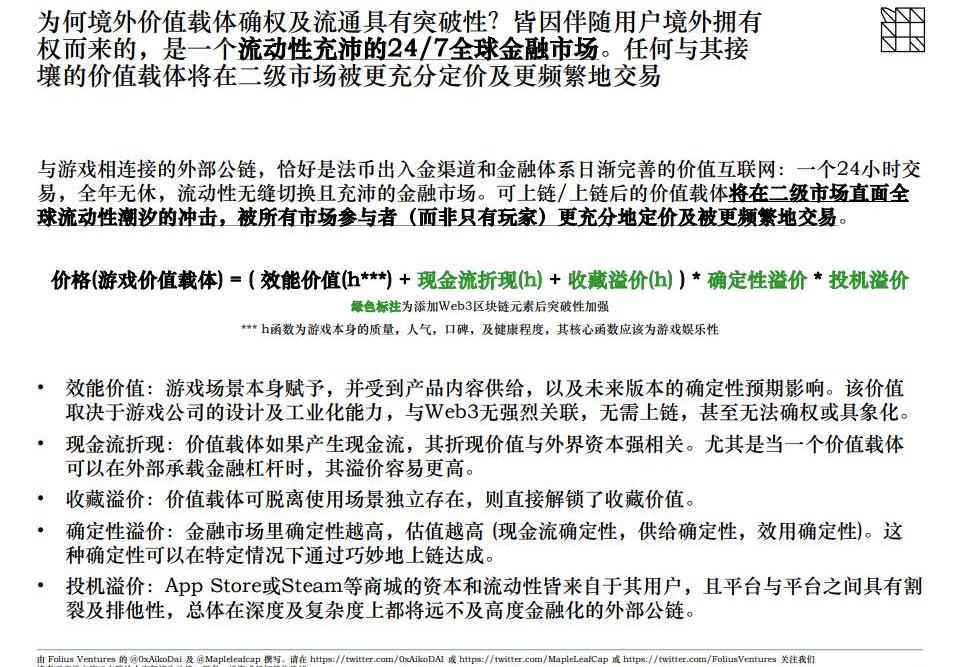 我们认为目前大多数Web3和游戏的结合点尚未成熟,而其中唯一较大的突破性在于:游戏价值载体能够在境外存在并自由流通,而开发者也获得了让世界流动性为游戏价值载体定价的自主选择权。