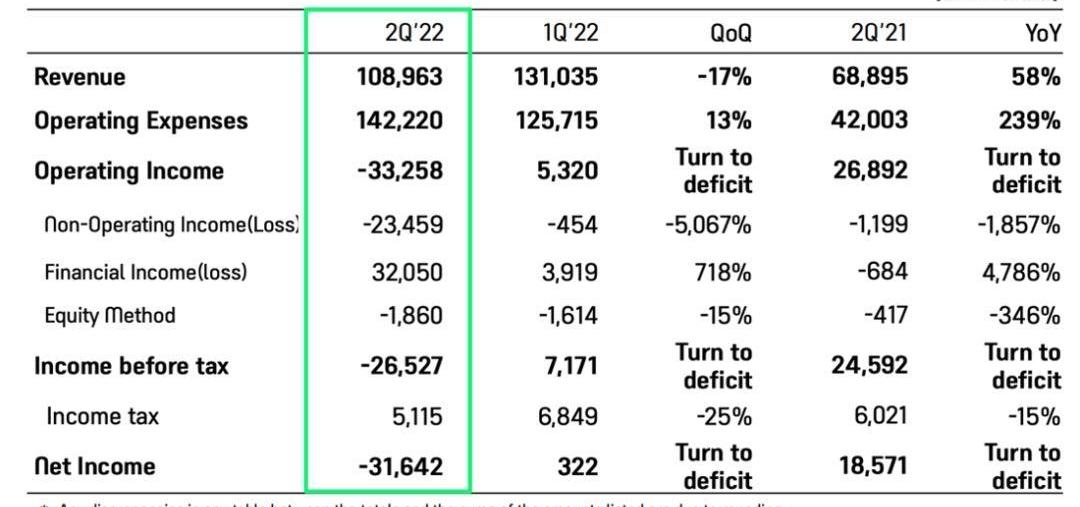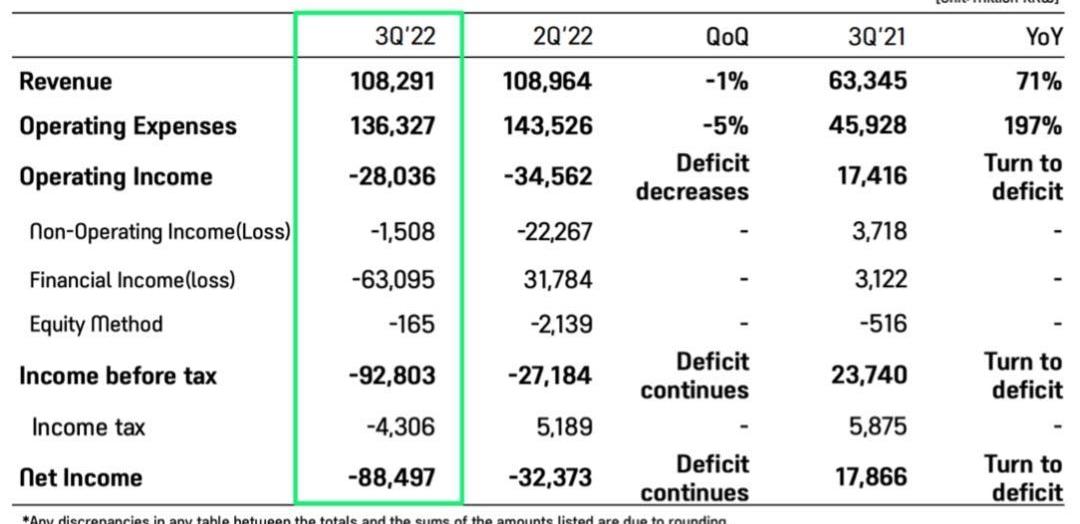 而在Wemade官网最新发布的三季度财报中,公司并未抑制住亏损的势头,并由于财务性收入上的损失,使得公司净收入亏损达到884.97亿韩元。