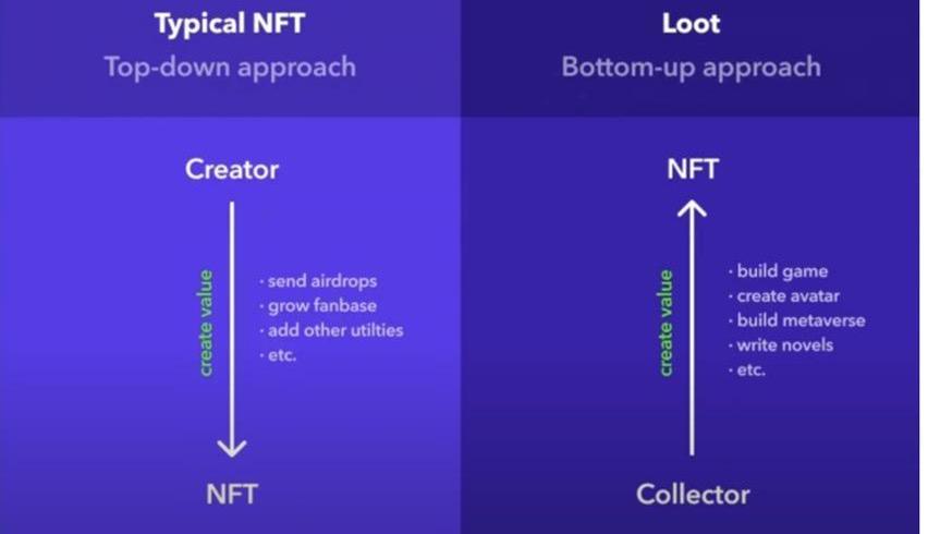 观点二:游戏内经济系统甚至物品的设计产出应当交由玩家,即纯粹的去中心化市场经济模式。这种模式在2021年9月的Loot生态中得到实践并引发市场关注。不同于传统Web3游戏项目,创作者设计创作NFT卖给收藏者,Loot收藏者也会参与到游戏生态的建设中。尽管Loot生态在后续的表现欠佳,但在2023年全链游戏进入视野时Loot又成为了人们的讨论话题。(有意思的是,?2022年底大火的MAGIC平台生态也是由2021年的Loot衍生出的项目)