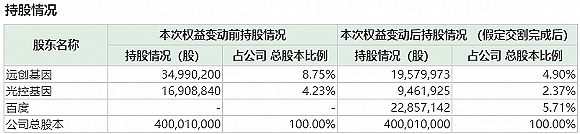 远创基因与光控基因为一致行动人,两者实际控制人均为中国光大控股有限公司。本次权益变动后,远创基因持有宇信科技股份1958万股,占公司总股本4.90%;光控基因持有宇信科技股份946万股,占公司总股本2.37%。百度通过战略投资成为宇信科技第五大股东。