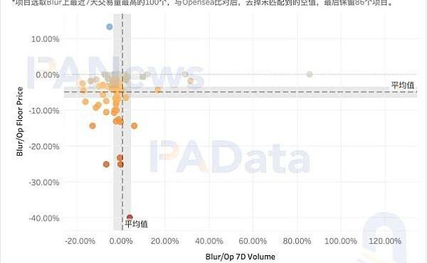 同一项目的跨市场价格表现可以对Bidding机制的影响做出更全面的了解。PAData还对比了Blur上最近7天交易量最高的100个项目的交易量和地板价与该项目在Opensea中的差距,去掉未能匹配的项目,共保留86个项目进行分析。