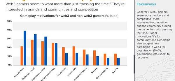 与传统游戏玩家群体相比,接受调查的Web3游戏玩家往往对竞争、社区和品牌更感兴趣,而不是仅仅为了“打发时间”而玩游戏。