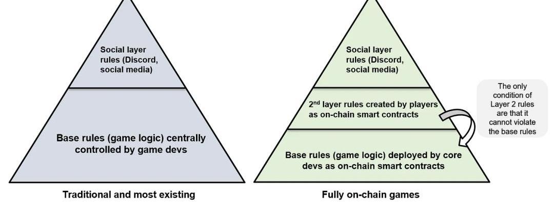 只要第二层规则不违反基础规则,它们就是被允许的。值得注意的是,第二层规则与现有游戏中的附加组件/mods不同,后者只改变你的个人用户界面和本地体验;它们被嵌入链上智能合约,影响与所有其他玩家共享的虚拟游戏体验。