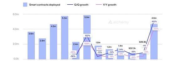 2022年,以太坊编程库的开发者活动增加了178%,下载量达到150万次。尽管市场不景气,但开发人员已经加强了现实世界的解决方案,并继续以惊人的速度在以太坊上构建智能合约,到2022年第四季度达到460万次部署。
