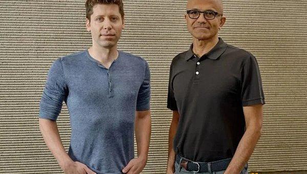 山姆·阿尔特曼与微软CEO萨蒂亚·纳德拉在位于华盛顿州雷德蒙德的微软总部合影。图片来源:IANC.BATES—THENEWYORKTIMES/REDUX