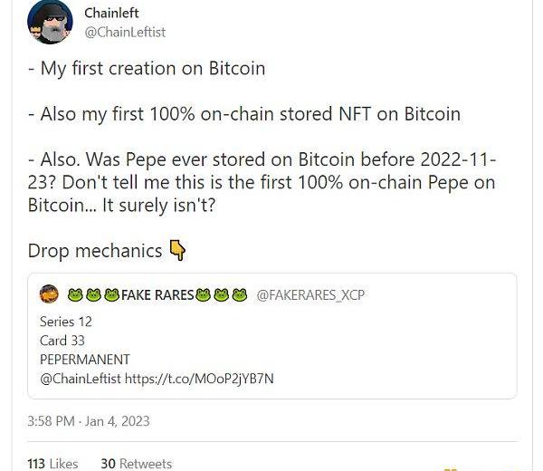 例如,艺术家、数据科学家和NFT历史学家Chainleft?于2022年11月在当前的Ordinals热议之前铸造了PEPERMANENT,这是一个完全在链上的比特币NFT实验。