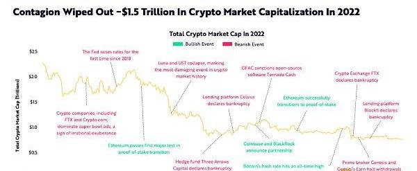 2022年,来自Terra/LUNA、ThreeArrowsCapital、Celsius和FTX/Alameda的传染性暴雷消灭了约1.5万亿美元的加密货币市场资本。