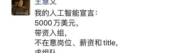 气氛都到这里了,那条「我的人工智能宣言」就真的被发了出来,「5000万美元,带资入组,不在意岗位、薪资和title,求组队。」