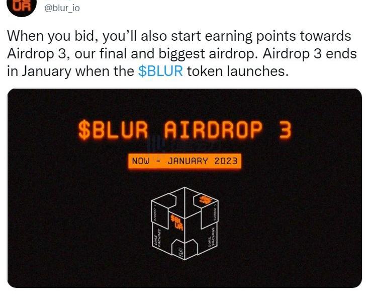 12月6日,NFT市场Blur发布公告宣布第二轮空投开放申领。此外将会上线第三轮空投活动,当用户出价时即可开始赚取Blur第三轮空投的积分,这是Blur最后一次、也是规模最大的一次空投。
