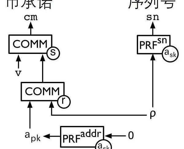 Zerocash的铸币交易过程:用户想把价值为v的比特币转换为Zerocash代币,用户首先生成3个随机数r,s,ρ,然后通过承诺计算cm和sn,其中cm记录币的生成,sn记录币的消费。币消费后会记录在sn列表中,其中cm和sn的生成如图所示: