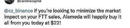 原文大致翻译如下:@cz_binance如果你想尽量减少市场对你销售FTT的影响,今天Alameda会很愿意以22美元的价格向你购买所有FTT!??