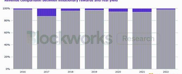 但分析一下收入构成,就会发现背后的问题......比特币通过区块奖励大量补贴安全性。95%的比特币矿工奖励来自通货膨胀的区块奖励,而只有5%是来自交易费的真实收入。