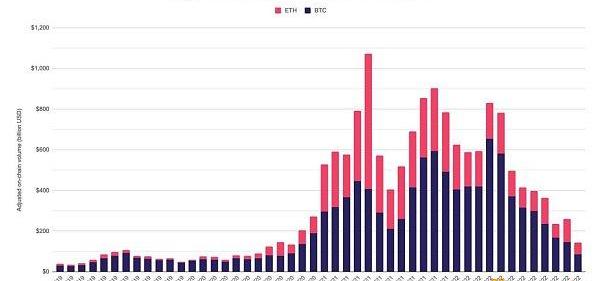 1、调整后链上总交易额下降了?44%?,跌至?1440?亿美元,其中比特币链上交易额下降了?41.1%?,以太坊下降了?49.6%?。