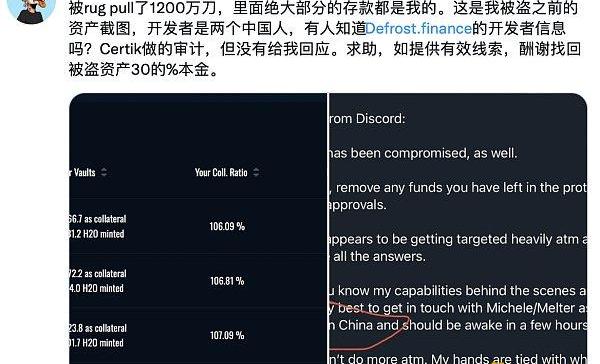 随后,名为?Hoi?的用户发推特并在社区内求助,称?DefrostFinance?中的大部分存款都由其提供,其个人损失了?1200?万美元,审计公司?CertiK?尚未回应,并请求大家提供线索。
