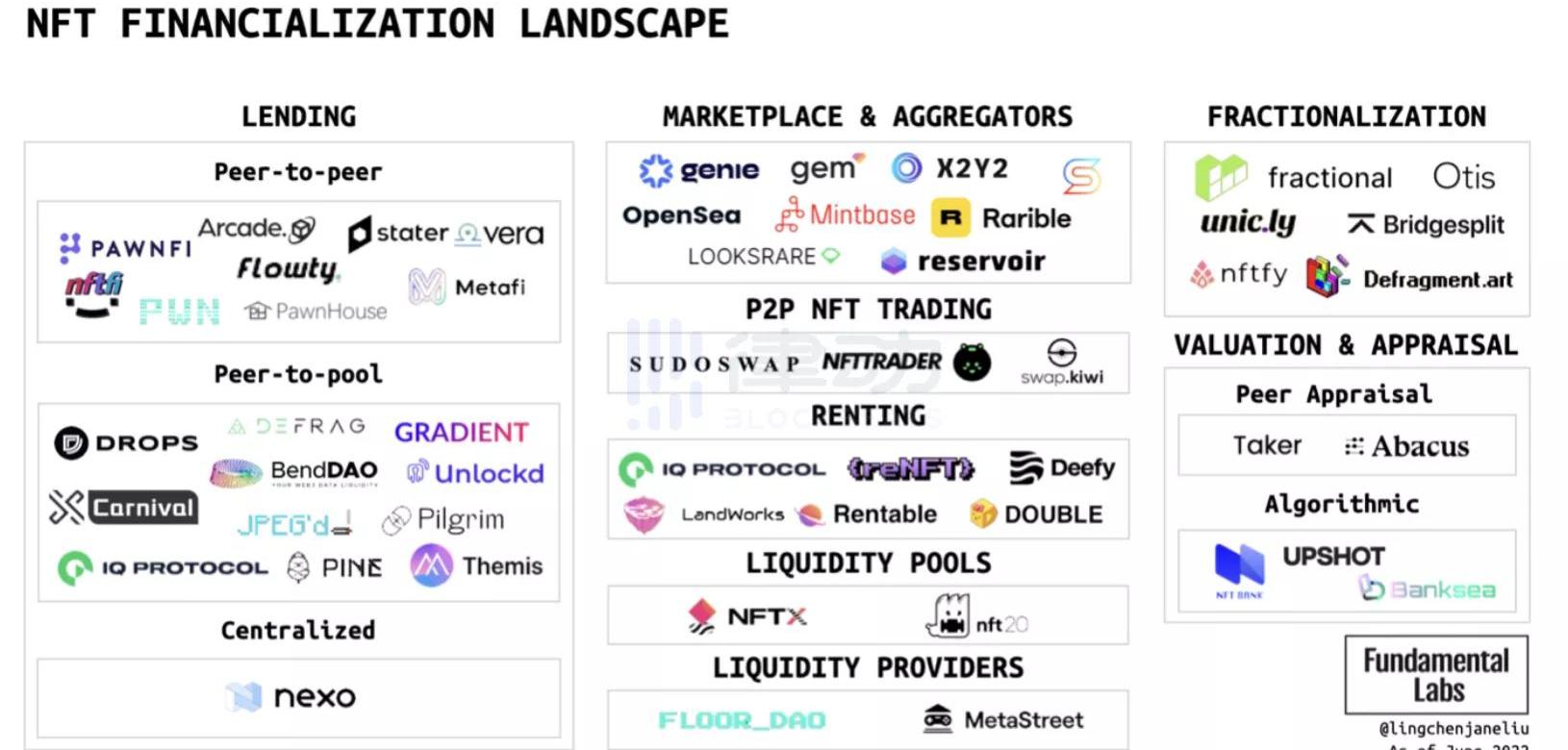 NFT金融化垂直领域包括:NFT市场和聚合器、AMM、流动性池、流动性提供者、碎片化、NFT借贷、租赁和估值等等,其中一部分领域便是用来解决上述问题的。
