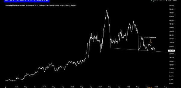 内容:DeFi市值/ETH的市值比率在2022年创下了更低的高点和更低的低点。