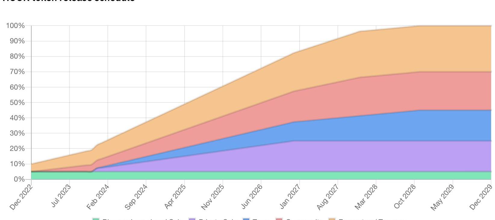 HOOKToken初始流通量5000万枚,一年后流通量19.16%,直到2029年释放完毕。根据币安Launchpad价格,HOOKToken上线后初始流通市值为500万美金,全流通市值5000万美金。根据CoinMarketCap数据,全流通市值全网排名320位左右。