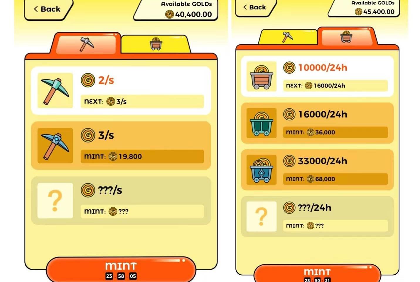 应用默认的挖矿效率为每秒挖出1枚Gold,挖矿时间为1h,单账号上限为每24h产出10000枚Gold。用户可通过点击Tap按钮来提升挖矿效率,也可以铸造挖矿效率更高的锄头。2HGT/s效率的锄头铸造价格为9600枚Gold,3/s效率的锄头铸造价格为19800枚Gold。同时可以提升矿车容量来提升每日可挖矿数量,16000/24h矿车铸造价格为36000枚Gold,33000/24h矿车铸造价格为68000枚Gold。