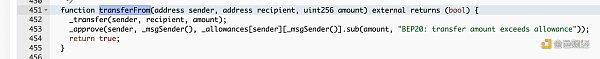 BSC-USD的合约源码显示transferFrom()函数顺序调用了转账_transfer()与授权_approve()函数