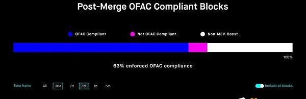 在激活了MEV-Boost的验证者中,通过MEV-Boost中继的区块中有94%正在执行OFAC合规性。这意味着在协议级别存在审查,这不利于去中心化。