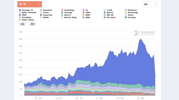 另一个方面是从用户数来看,Uniswap 目前依然遥遥领先,超过其他所有 DEX 用户之和。参考 DeBank 统计的独立地址数,在流动性迁移后,SushiSwap 的用户数量占比仅有 Uniswap 的零头。