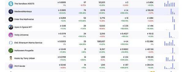 24小时NFT交易量、交易量前十项目数据来源:Coinmarketcap