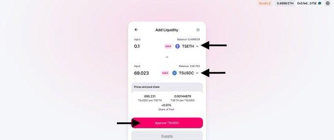 让我们添加流动性,切换到池并单击添加流动性,将代币分别设置为TSETH和TSUSDC,设置数量并单击批准TSUSDC并在MetaMask中确认,然后单击“supply”,随后在MetaMask中单击确认供应并批准交易。