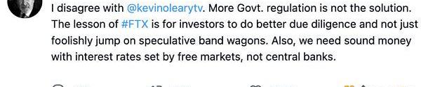 更多的政府监管不是解决办法。FTX的教训是让投资者进行更好的尽职调查,而不是愚蠢地跳上投机狂潮。此外,我们需要由自由市场而非中央银行设定利率的稳健货币。