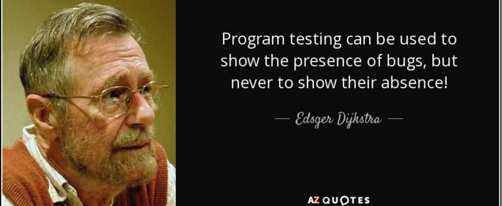 “测试可以有效的发现程序存在的缺陷,但是它却无法证明程序不存在缺陷。”——EdsgerWybeDijkstra