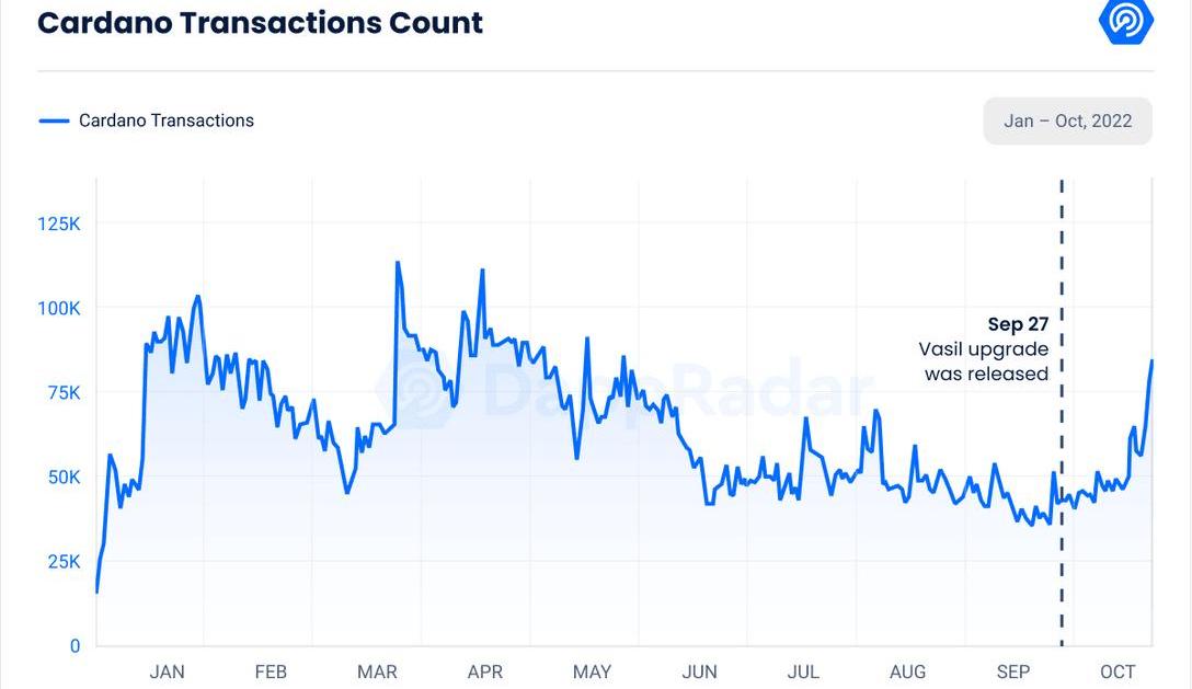 Cardano区块链上的网络活动激增。10月19日,网络交易量达到82,880笔,为5月以来的最大数字。有了这些数字,区块链网络环比增长了75%。Vasil升级于9月22日在Cardano主网上启动,完整功能于9月27日发布。由于Vasil升级,Cardanodapp的用户参与度大幅增加。