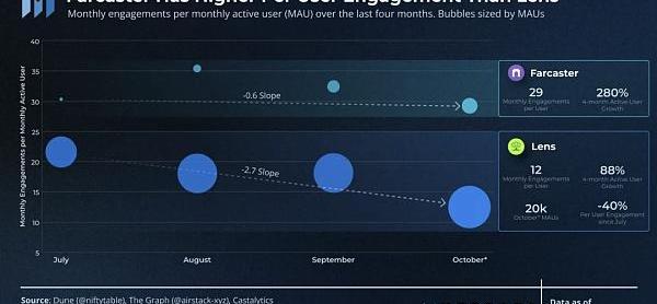 到目前为止,10月份Lens拥有20,000名活跃用户,这是该协议的历史最高水平,是Farcaster的近8倍;