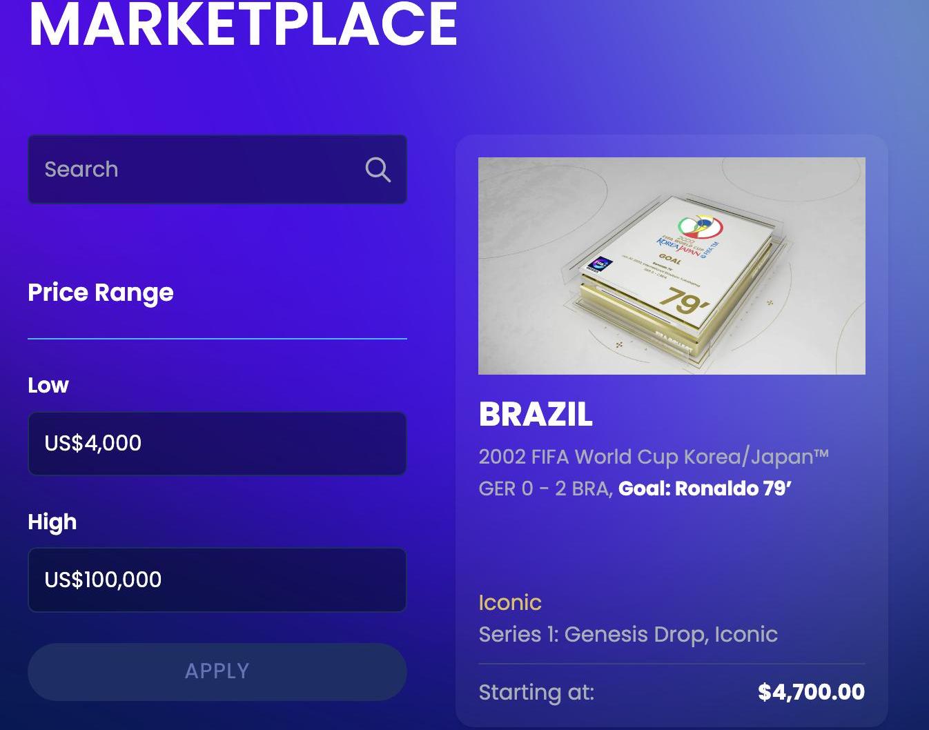 目前二级市场上最贵的NFT是2002世界杯德国队对阵巴西队时,罗纳尔多进球画面对应的NFT,地板价为4700美元。