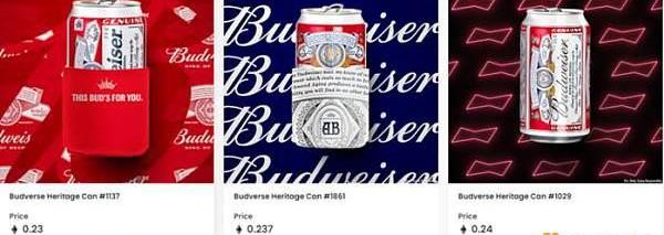 2021年,百威啤酒发行了以品牌啤酒罐为主题的传承版NFTBudverseCansHeritageEdition,共发行了1936个,而1936对应着百威首次推出罐装啤酒的年份,当年百威也有了首版品牌LOGO,这些NFT记录了百威啤酒过往的历史性时刻、设计照片和罐装啤酒的发展历程。