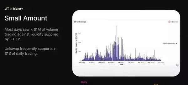 a.JIT流动性简单来说就是LP检测到有大额交易swap时,瞬时注入大量流动性并在swap结束后撤出。根据数据分析,JIT流动性在历史上大多数时间小于1M,与总体Uni的流动性比较,占比小于1%。LP通过JIT赚取的手续费的角度看,占比更低。