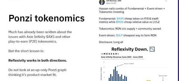 Richard在旁氏模型这部分主要通过AxieInfinity来阐述了Reflexivityworksinbothdirections,即反身性是双向的。不能看着一只向上走的旁氏数据图像,就以为它达到了产品与市场的契合点。