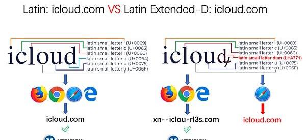 当字体或渲染引擎对字符或字符序列的支持不足时,就使得本应该在视觉上可以区分的字符或字符序列出现新的问题--视觉混淆。尤其是这些字符被做为关键的信息出现时,比如在浏览器重要的安全指示器地址栏中,这种视觉的危害就会显而易见。浏览器厂商对于地址栏上的IDN问题,一直在做积极的防御,通常是在浏览器里维护一个重要域名列表,如果一个域名和列表中的域名同形异议,则将其转化为Punycode编码显示。