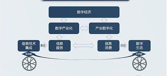 元宇宙是一个庞大的数字生态,这个数字生态能吸引更多用户进行信息消费,从而促进产业数字化,并进一步通过产业数字化和数字产业化的提升来推动数字经济的发展。在这个过程中,不难发现区块链以及新一代信息技术是基础设施,而元宇宙是一个数字的消费生态,通过“一个推动、一个拉动”来共同促进数字经济的发展。