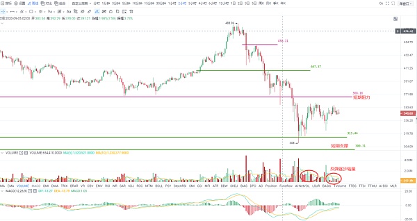 继续顺势看空是王道,建议接下来重点关注368一线阻力,可以看作中短期强弱分界线,在没有明确上破之前不要盲目追涨反弹行情。下跌格局虽然完好,但是如果价格在此创出新低很容易形成底背离结构,所以在看到创新低后不要恐慌而杀跌,此时反而很可能是博弈短线反弹的机会,这个可能引发反弹的位置关注300-315区间。