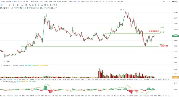 同样,短期都由于已经出现了绝对大的跌幅,所以继续大幅下跌的概率较小,可以继续关注位于150附近的低点支撑,再次靠近依然有较大希望迎来反弹。