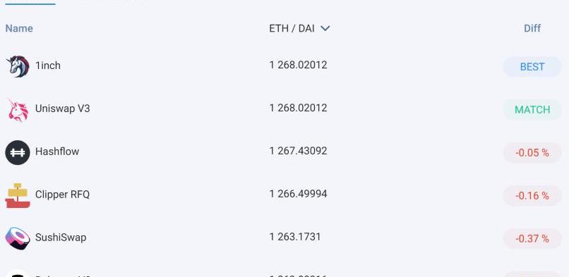以1inch为例,通过上图的界面,用户可以选择滑点最低的DEX进行交易。