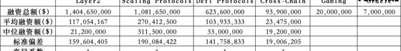 总体数量太少,不具有统计意义。总体来说,Layer1&Layer2属于融资额度高,赛道火热。按照技术流分项目的话,融资额度相差不大。