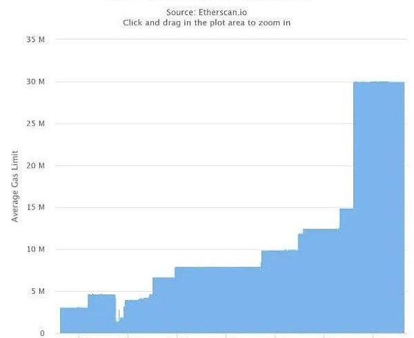 以太坊平均gas限制图表显示了以太坊网络的历史每日平均gas限制。与最大区块大小为1MB的比特币不同,以太坊在技术上没有最大区块大小。然而,限制每个区块消耗的gas有助于管理以太坊区块链的增长以及运营矿工或节点的成本。图片来源:Etherscan